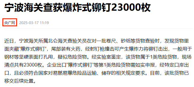 例如月初,寧波海關(guān)報(bào)道了一起瞞報(bào)事件,某企業(yè)申報(bào)的"普通滅火器"內(nèi)部,竟藏著50多萬(wàn)枚"爆炸式鉚釘",——每個(gè)鉚釘尾部都暗藏火藥,經(jīng)過(guò)鑒定,這些都屬于1.4S爆炸物的危險(xiǎn)品,稍有不慎就可能釀成船毀人亡的慘劇,而這家企業(yè)也受到了應(yīng)有的處罰。